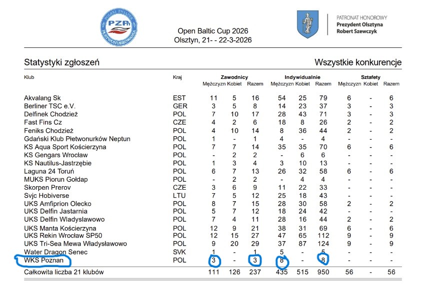Już w najbliższy weekend, w Olsztynie odbędą się II międzynarodowe zawody w pływaniu w płetwach OPEN BALTIC CUP 2026! Na słupkach startowych zobaczymy ponad 230 zawodników z Estonii, Niemiec, Czech Słowacji, Litwy oraz Polski, w tym naszych 3 zawodników: Leona rocznik 2013 kat. D, Jakuba rocznik 2011 kat. C i Antoniego rocznik 2008 kat. Open.