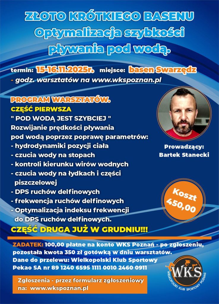 Zapraszamy na kolejne warsztaty z trenerem Bartkiem Staneckim: “Skarb krótkiego basen cz. 1” Tym razem spotykamy sie na basenie w Swarzędzu.